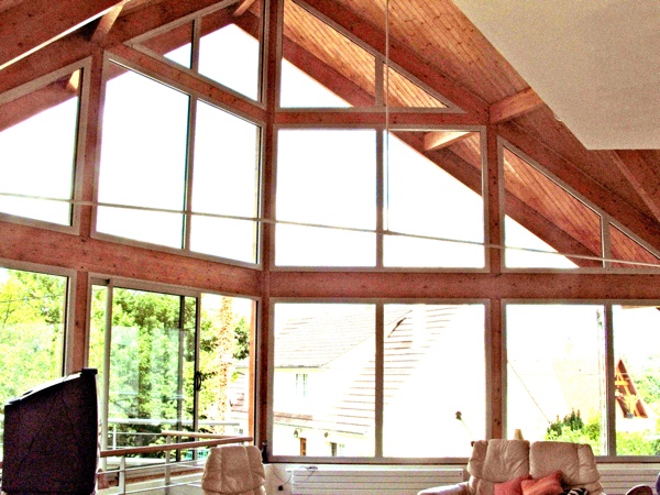 Structurellement, il s’agit d’une construction bois classique, alliant la technique poteau-poutre en lamellé collé pour le volume principal et l’ossature isolée en ouate de cellulose ainsi que le thermopierre pour les parties murales en enveloppe.