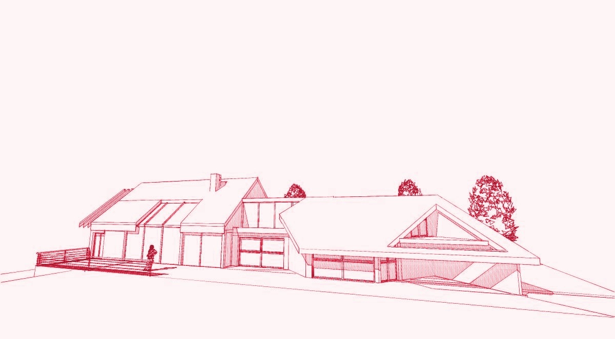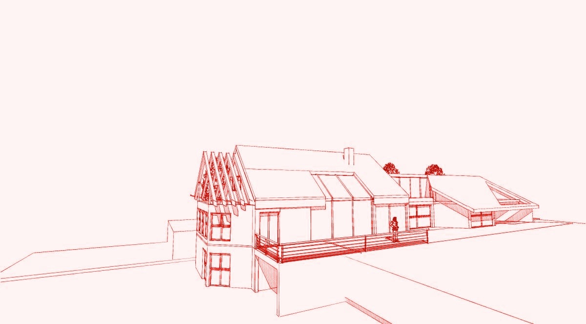 Perspective Sud-Est – Extension bois comprenant la suite parentale, le Spa et un bureau avec terrasse à l’étage